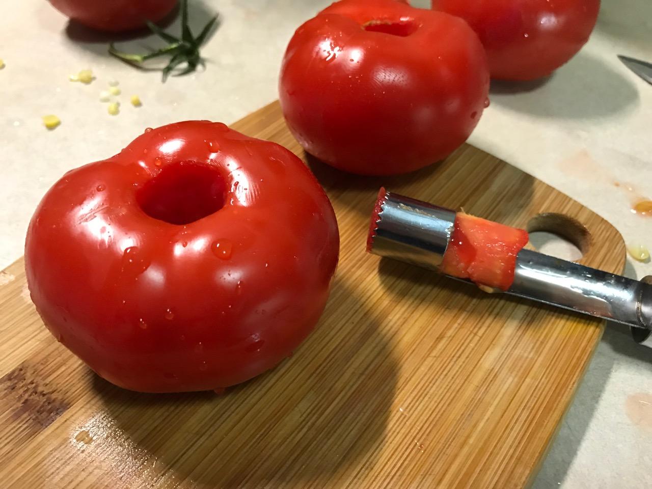 For years I cut the tops and the bottoms off of tomatoes, then cut the pieces from both that were usable minus the stem parts. Now I core them first. It saves time and product. So easy.